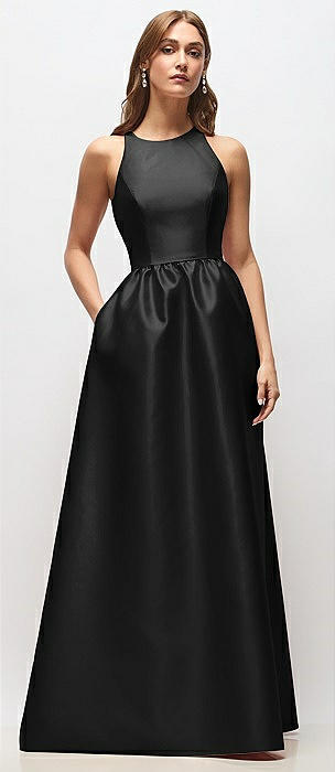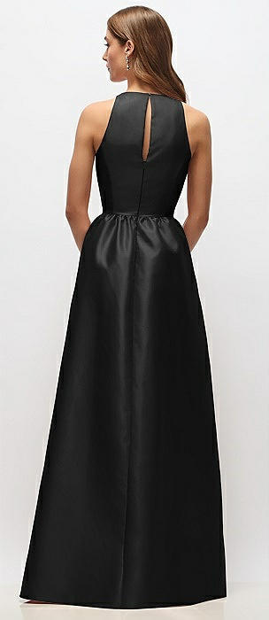High-Neck Halter Stretch Satin Maxi Dress with Bias A-line Skirt in black