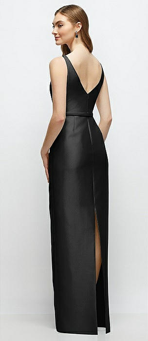 Bateau Neck Satin Column Dress with Bow-Trimmed Skinny Belt in black