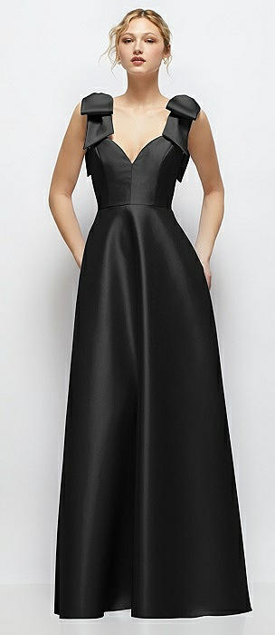 Deep V-Neck Satin Ball Gown with Shoulder Bows in black
