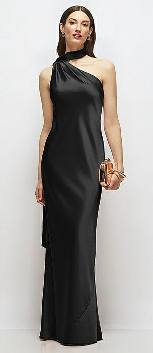 Draped Scarf One-Shoulder Bias Stretch Satin Maxi Dress in black