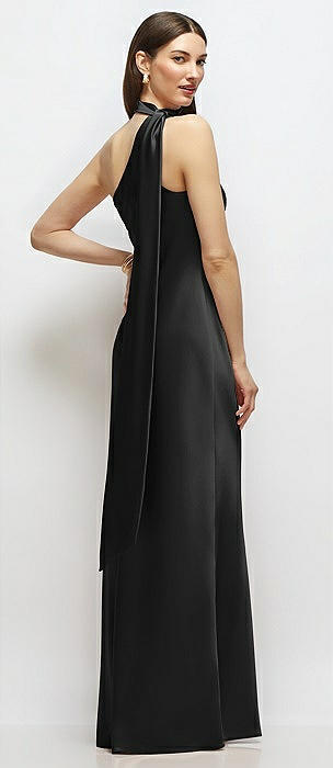 Draped Scarf Halter Open-Back Stretch Satin Bias Maxi Dress with Adjustable Straps in black