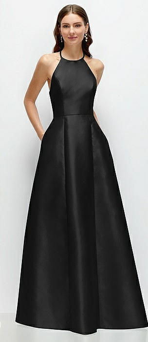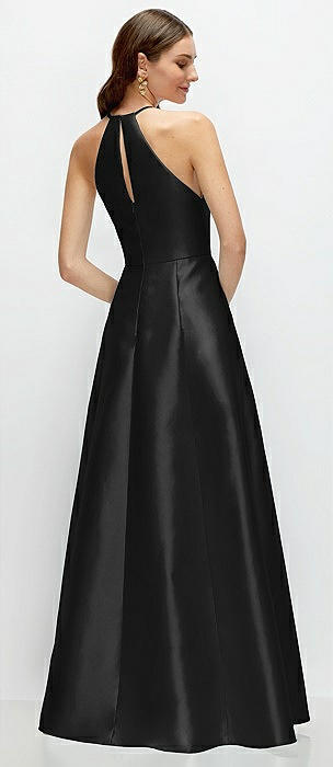 Jewel Neck Halter Full A-Line Satin Maxi Dress in black