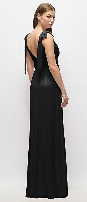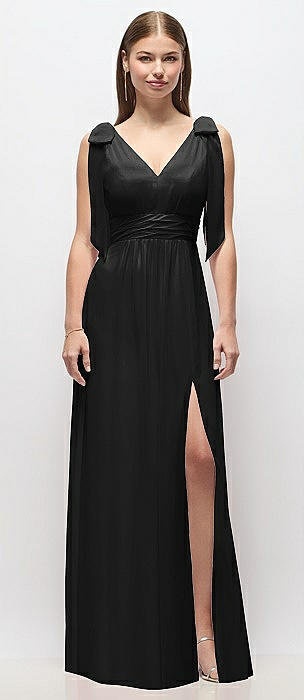 Plunge Neckline Bow Shoulder Empire Waist Chiffon Maxi Dress in black