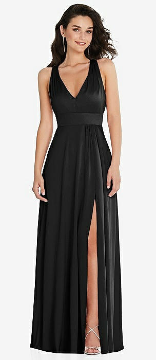 Spaghetti Strap Draped Skirt Gown with Front Slit in black