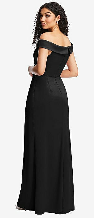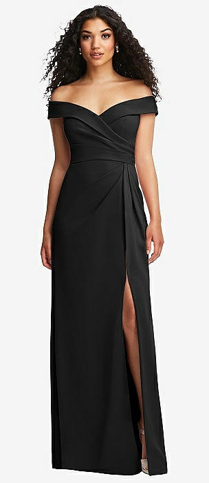 Cuffed Off-the-Shoulder Pleated Faux Wrap Maxi Dress in black