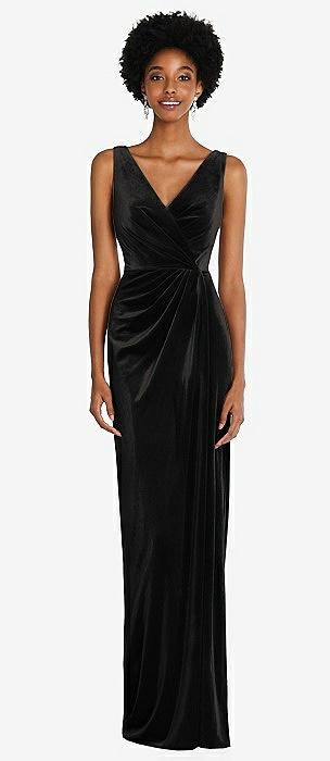 Draped Skirt Faux Wrap Velvet Maxi Dress in black