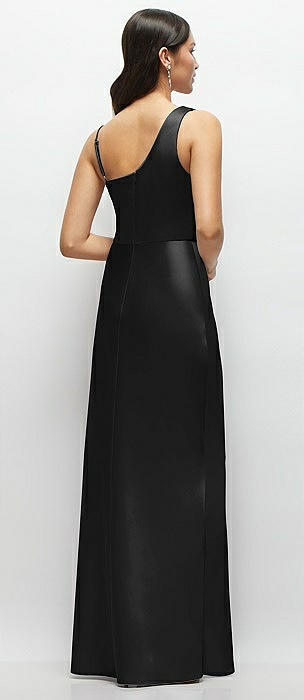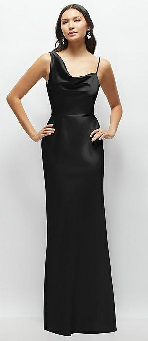 One-Shoulder Draped Cowl A-Line Satin Maxi Dress in black