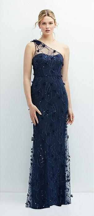 One-Shoulder Fit and Flare 3D Floral Embroidered Dress in midnight navy