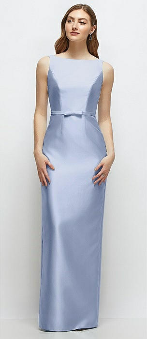 Bateau Neck Satin Column Dress with Bow-Trimmed Skinny Belt in sky blue