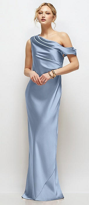 One-Shoulder Draped Skirt Satin Trumpet Gown in sky blue