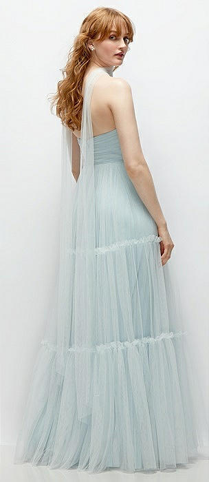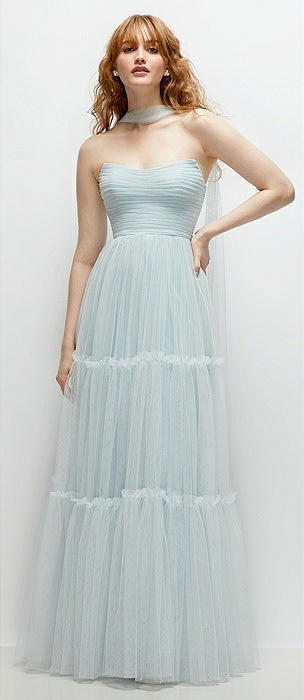 Strapless Cat-Eye Neu Tulle Tiered Maxi Dress with Convertible Sash in mist