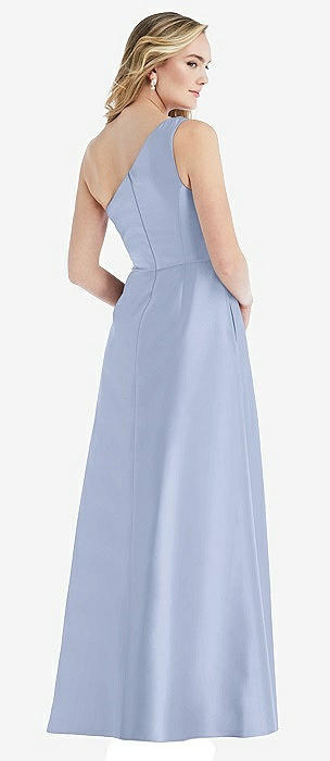 Pleated Draped One-Shoulder Satin Maxi Dress with Pockets in sky blue