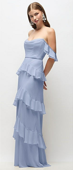 Off-the-Shoulder Cowl Chiffon Tiered Ruffle Maxi Dress with Convertible Ruffle Straps in sky blue