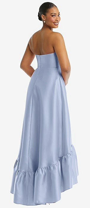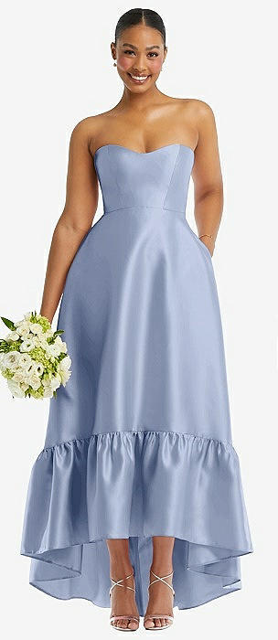 Strapless Deep Ruffle Hem Satin High Low Dress with Pockets in sky blue