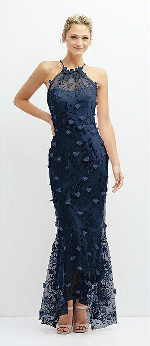 Sheer Halter Neck 3D Floral Embroidered Dress with High-Low Hem in midnight navy