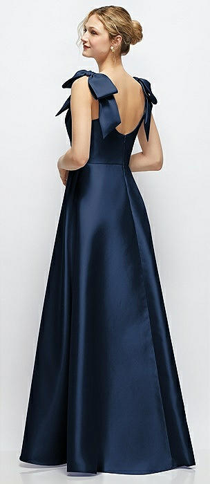 Deep V-Neck Satin Ball Gown with Shoulder Bows in midnight navy