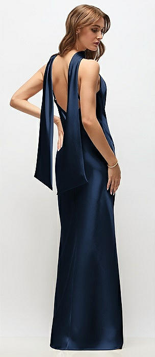 Draped Scarf Halter Open-Back Stretch Satin Bias Maxi Dress with Adjustable Straps in midnight navy