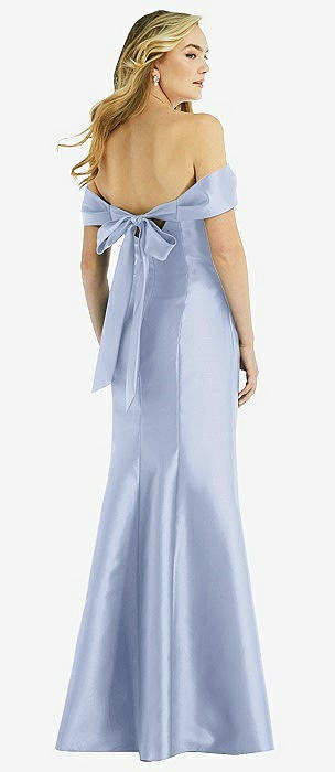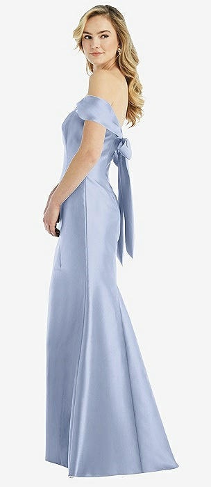 Off-the-Shoulder Bow-Back Satin Trumpet Gown in sky blue