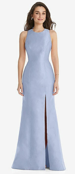 Jewel Neck Bowed Open-Back Trumpet Dress with Front Slit in sky blue