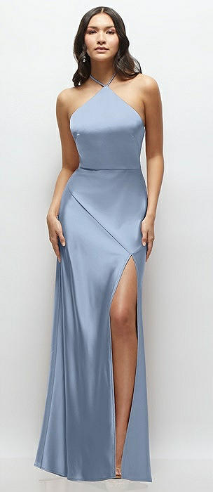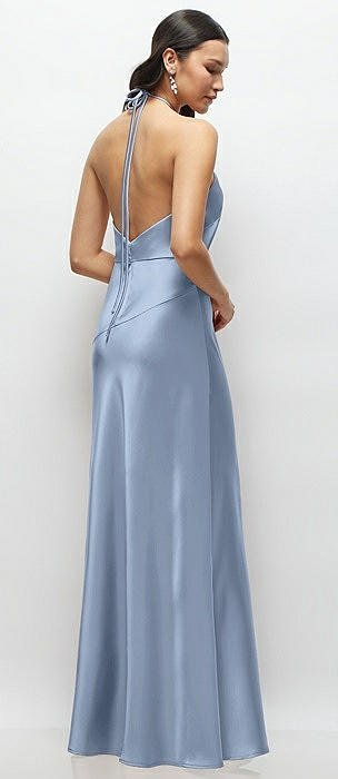 High Halter Tie-Strap Open-Back Satin Maxi Dress in cloudy