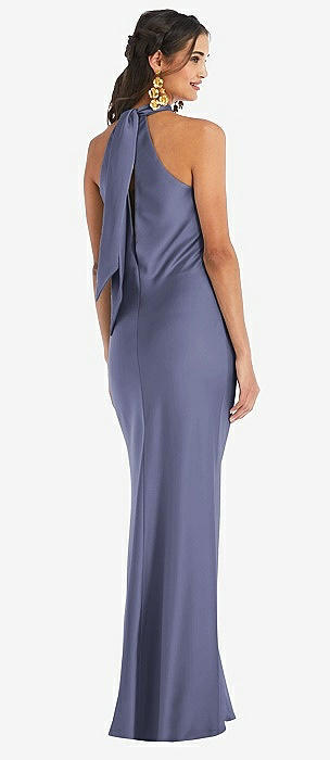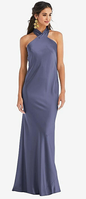 Draped Twist Halter Tie-Back Trumpet Gown in french blue