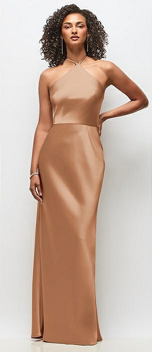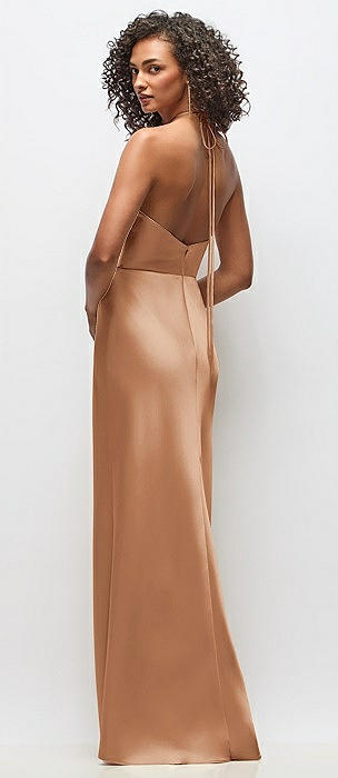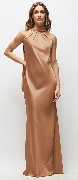 Draped Scarf Halter Open-Back Stretch Satin Bias Maxi Dress with Adjustable Straps in toffee