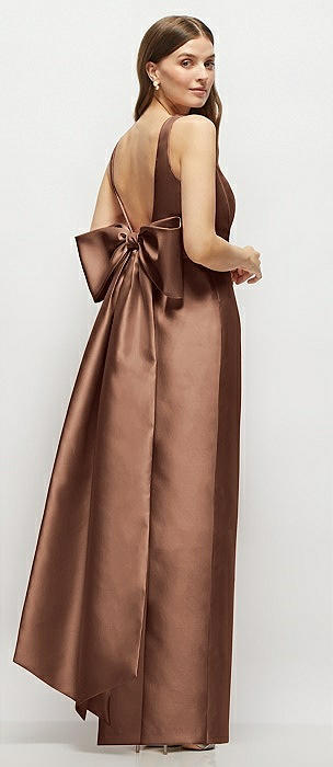 Scoop Neck Satin Column Maxi Dress with Bow at Empire Waist in cognac
