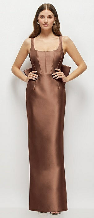 Scoop Neck Corset Satin Maxi Dress with Floor-Length Bow Tails in cognac