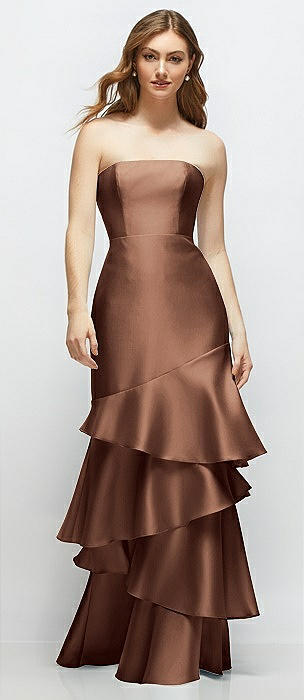 Strapless Satin Maxi Dress with Cascade Ruffle Peplum Detail in cognac