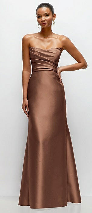 Strapless Cat-Eye Draped Bodice Satin Tumpet Dress in cognac