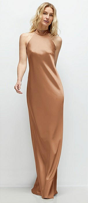 High Halter Tie-Strap Open-Back Satin Maxi Dress in toffee