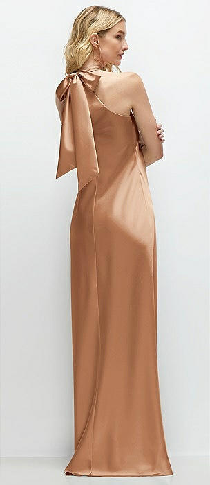 Pleated Halter Bias Satin Maxi Dress with Self-Tie Bow Back in toffee