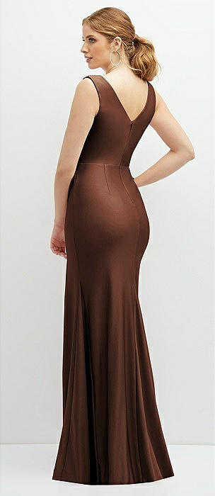 Draped Wrap Stretch Satin Mermaid Dress with Horsehair Hem in cognac