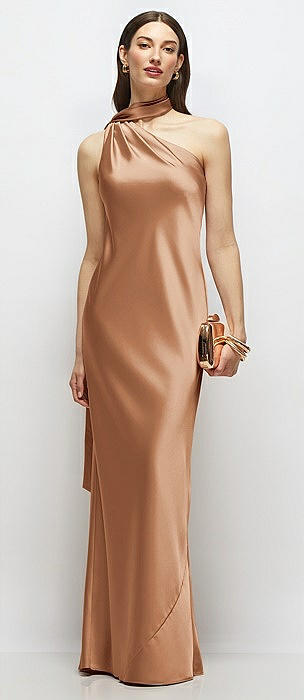 Draped Scarf One-Shoulder Bias Stretch Satin Maxi Dress in toffee