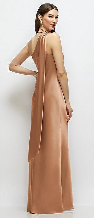 Pleated Halter Bias Satin Maxi Dress with Self-Tie Bow Back in toffee