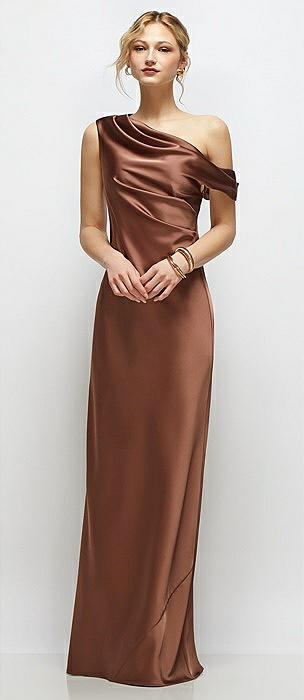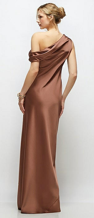 Draped One-Shoulder Bias Stretch Satin Maxi Dress in cognac