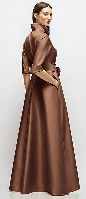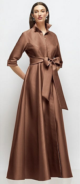 3/4 Sleeve Satin Shirt Dress Gown with Sash and Jeweled Buttons in cognac