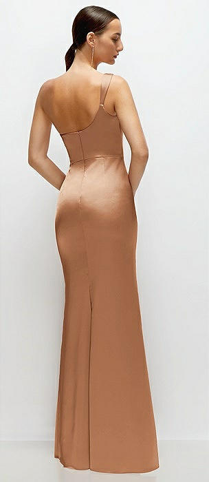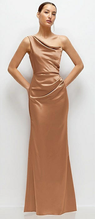 One-Shoulder Draped Bodice Stretch Satin Column Maxi Dress in toffee