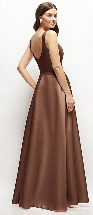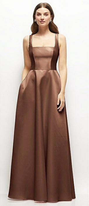 Square-Neck Satin Maxi Dress with Full Skirt in cognac