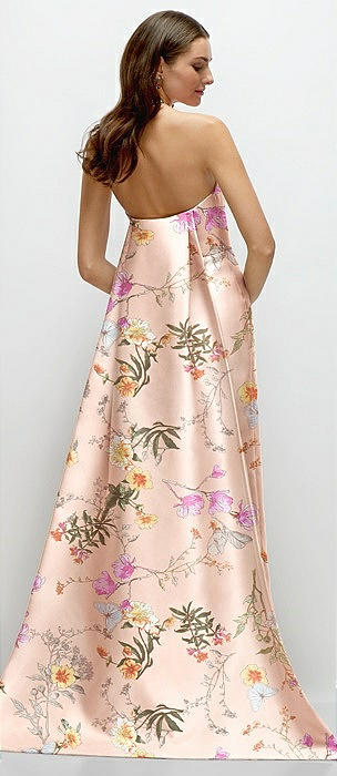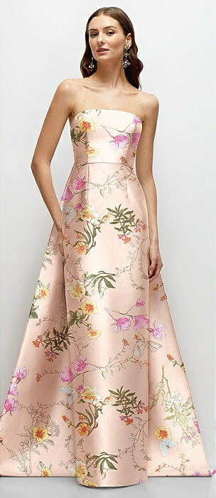 Strapless Floral Satin Column Dress with Removeable Watteau Train in butterfly botanica pink sand