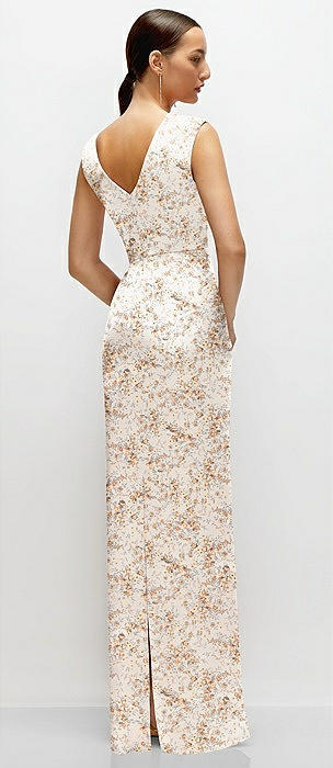 Deep V-back Floral Satin Trumpet Dress with One-Shoulder Cascading Bow in sage cottage rose
