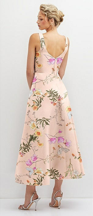 Floral Square Neck Satin Midi Dress with Full Skirt & Pockets in butterfly botanica pink sand