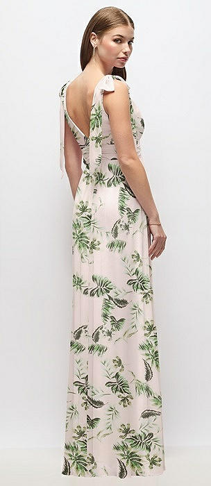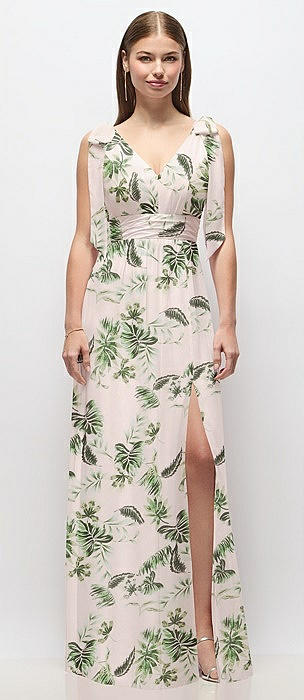 Bow-Shoulder V-Back Chiffon Gown with Front Slit in palm beach print
