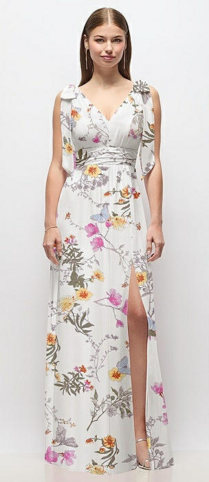 Plunge Neckline Bow Shoulder Empire Waist Chiffon Maxi Dress in butterfly botanica ivory