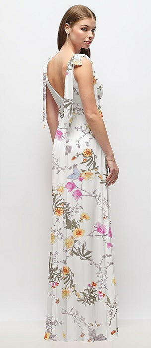 Bow-Shoulder V-Back Chiffon Gown with Front Slit in coquette floral print