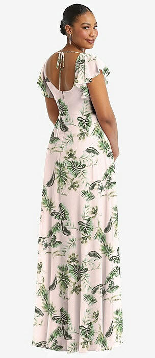 Flutter Sleeve Scoop Open-Back Chiffon Maxi Dress in palm beach print