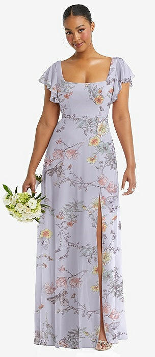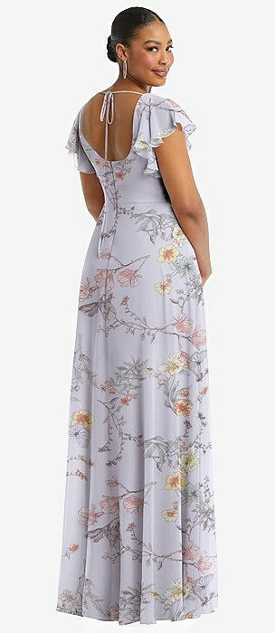 Flutter Sleeve Scoop Open-Back Chiffon Maxi Dress in butterfly botanica silver dove