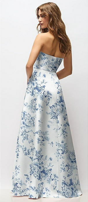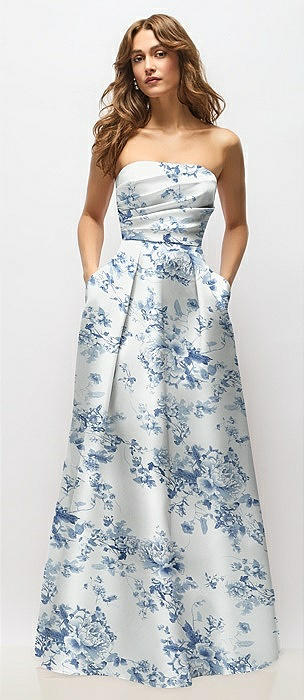 Strapless Hand-Pleated Bodice Floral Satin Maxi Dress with Full Pleated Skirt in porcelain blue seraphina floral