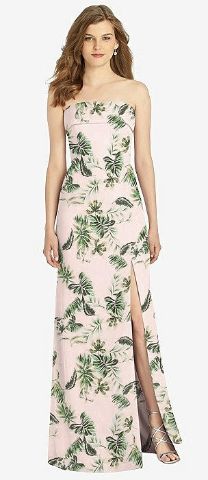 Bow-Shoulder V-Back Chiffon Gown with Front Slit in palm beach print