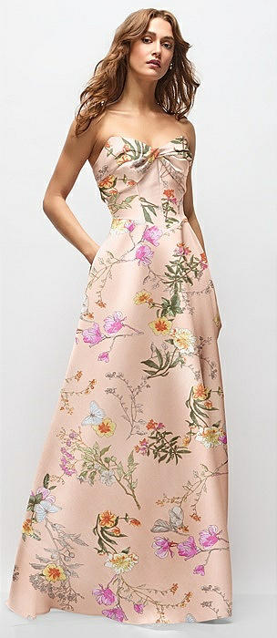 Strapless Twist Cuff Neck Floral Satin Maxi Dress with Basque-Waist & Full Skirt in butterfly botanica pink sand